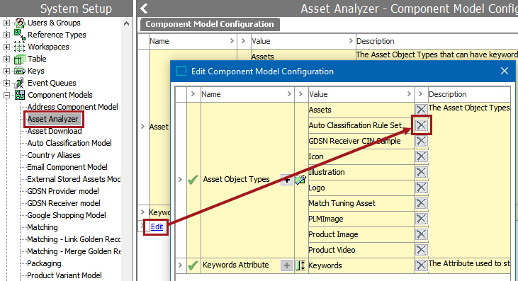 - While still in System Setup, select the Asset Analyzer component model and click the 'Edit' hyperlink. The Edit Component Model Configuration window displays.