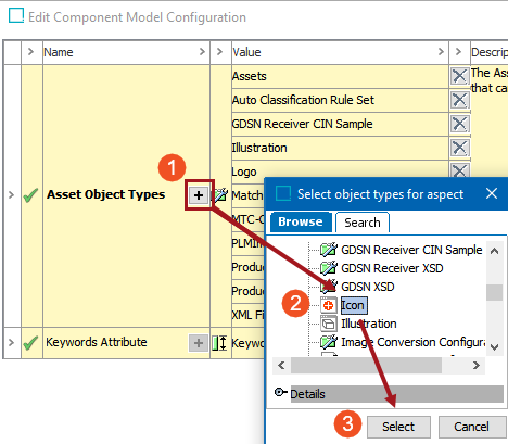 - Select the asset object type(s) that you want to add to the component model, then click Select.
