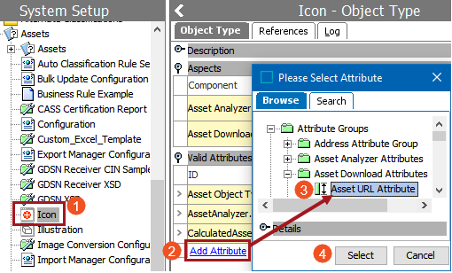 2. In the attribute dialog, browse to or search for the Asset URL Attribute, then click Select.