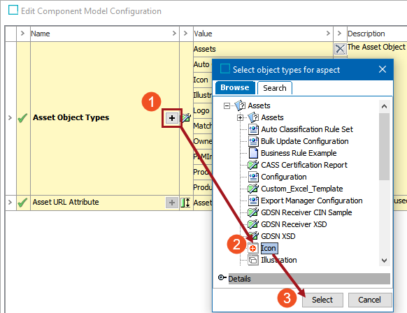 1. Select the asset object type(s) that you want to add to the component model, then click Select.
