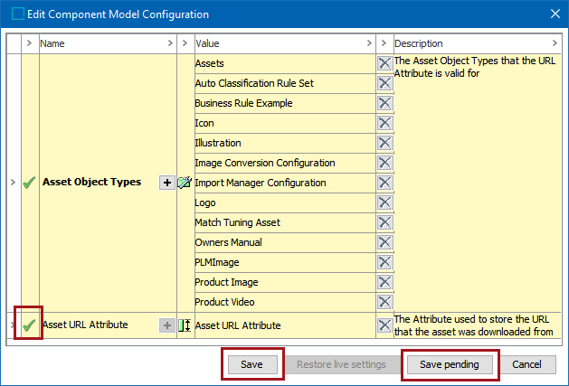 1. The Save and Save pending buttons are activated. Click Save to remove the asset object type and close the 'Edit Component Model Configuration' dialog. Click Save pending to keep the live configuration as-is and make additional changes later.