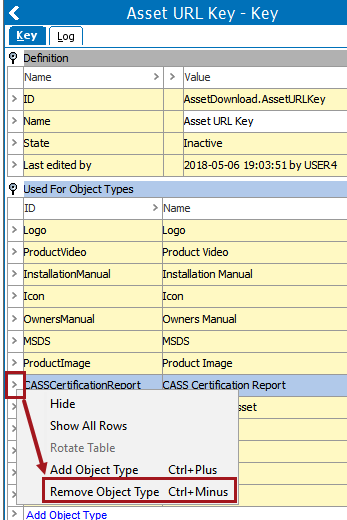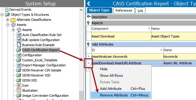 2. Right-click on the arrow in the row containing the object that you want to remove, then click Remove Object Type. This example uses the 'CASS Certification Report' asset object type.