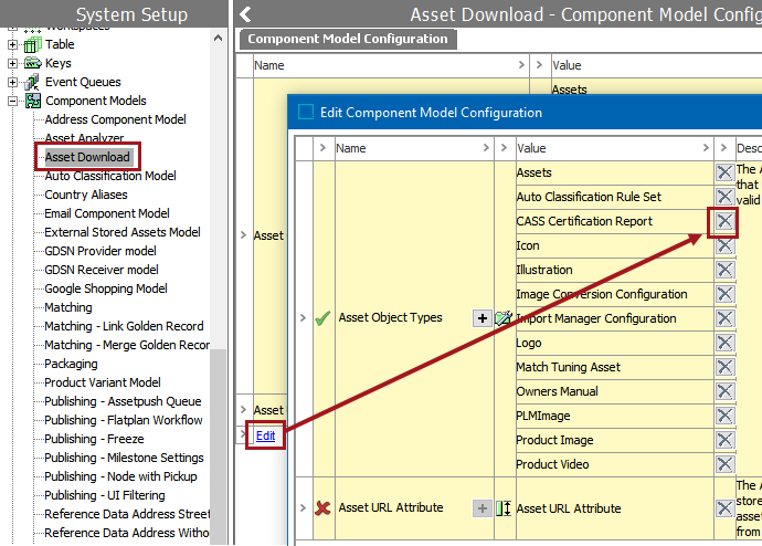 1. While still in System Setup, select the Asset Download component model (under Component Models), then click the 'Edit' hyperlink. The Edit Component Model Configuration window displays.