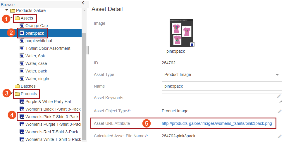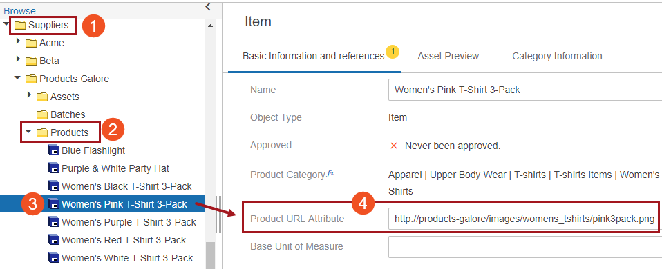 - In the Web UI, for our example, there are multiple products stored in a Suppliers classification structure (1, below) within a Products folder (2). The product named 'Women's Pink T-Shirt 3-Pack' (3) is selected, and contains a URL to an asset in the 'Product URL Attribute' field (4).