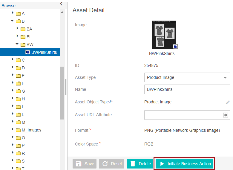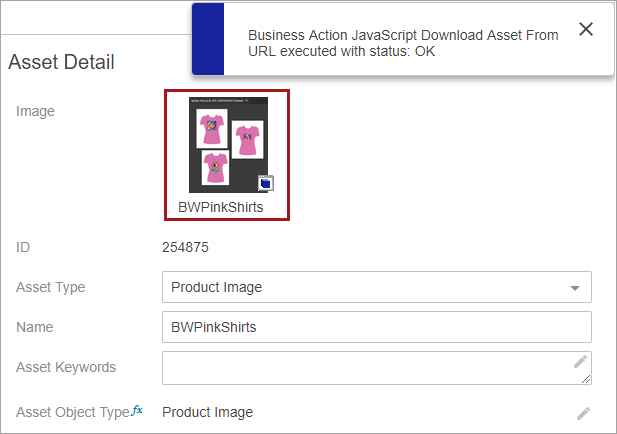 - Click the 'Initiate Business Action' button to run the JavaScript Download Asset From URL business action. The image is downloaded from the URL specified in the JavaScript and has replaced the content of the asset. Now, the correct image of the pink t-shirts is displayed.