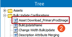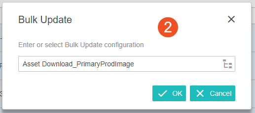 - To perform the bulk update, click the Bulk update action button, then choose the 'Asset Download_Primary ProdImage' bulk update configuration. For information on how to add an action button to a Node List Properties screen, refer to the Action Button Configuration on a Node List topic in the Web User Interfaces documentation.