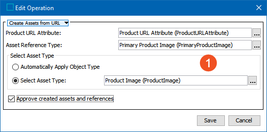 - The Create Assets from URL bulk update will be configured, then saved as a bulk update configuration. In this example, the configuration is named 'Asset Download_PrimaryProdImage.'
