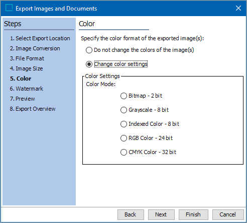 In the Color step, users can apply a color change to exported image(s) by selecting a color mode.