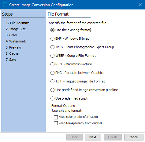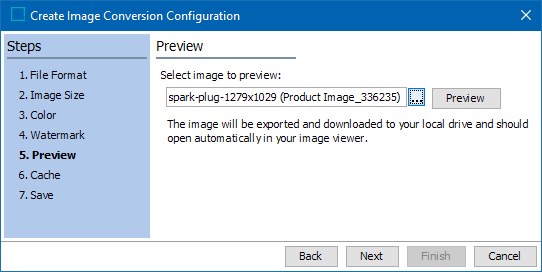 Image conversion configurations define a group of image settings to be used during export to change the format, size, and/or color of an image, to add watermarks to images, and to specify when to cache images. An image conversion configuration can also be used to ensure that the image is not changed upon export, meaning that the format, size, and color exported are identical to that stored in STEP.