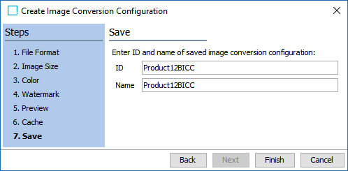 - For the Save step, enter an ID and name for the Image Conversion Configuration.