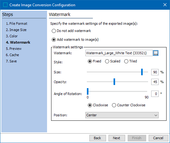 If watermarks are necessary, select Add watermarks to image(s) and configure the relevant Watermark settings. For detailed information on these settings, refer to the Watermark topic.