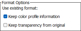 Keep the current / original format of the image. Keep color profile information Keep transparency from original: When checked, a transparent background in the original is retained. This option is ignored when the 'Fixed canvas size' option on the Image Size step is selected, as defined in the Image Size topic. |
