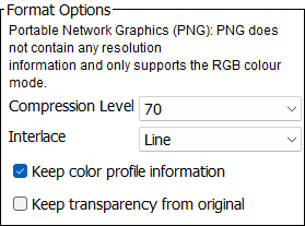 Convert the image to .PNG format via the parameters: Compression Level: From 0 - 90 in increments of 10 Interlace: Line, Pixel Keep color profile information PNG supports only RGB-color mode. Keep transparency from original: When checked, a transparent background in the original is retained. This option is ignored when the 'Fixed canvas size' option on the Image Size step is selected, as defined in the Image Size topic. |