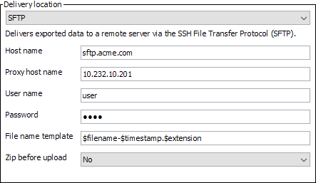 • SFTP delivers a file using the Secure File Transfer Protocol (SFTP). You must specify the host name of the remote server, the proxy host name (optional), the user name and password used to log on to the remote server, a file name template, and whether the files should be zipped before uploaded. For additional details on these options, refer to the SFTP Delivery Method topic in the Data Exchange documentation.