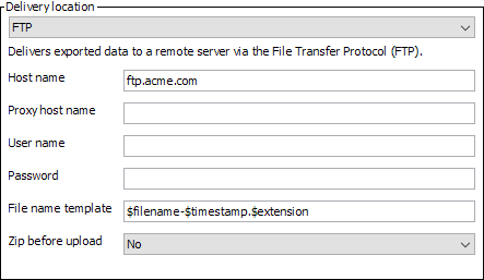 • FTP delivers a file using file transfer protocol (FTP). You must specify the host name of the remote server, the proxy host name (optional), the user name and password used to log on to the remote server, a file name template, and whether the files should be zipped before uploaded. For additional details on these options, refer to the FTP Delivery Method topic in the Data Exchange documentation.