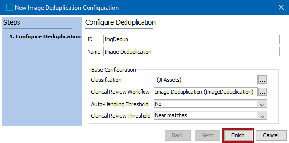 Creating an Image Deduplication Configuration defines the group of images that will be evaluated, as well as the workflow that is used for error handling and managing duplicate sets identified for clerical review, whether or not auto-handling is enabled, and the matching threshold for images sent to clerical review.