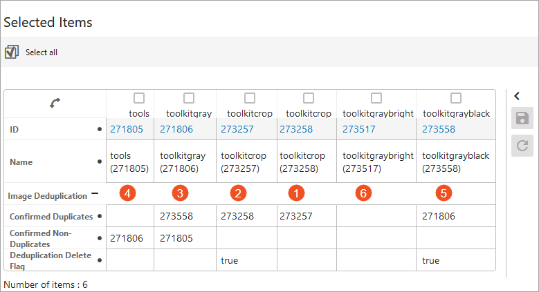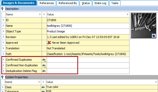 - Image 'toolkitgrayblack (273558)' was marked as a duplicate, so it shows the master ID as a confirmed duplicate and the Deduplication Delete Flag is set to 'true.'