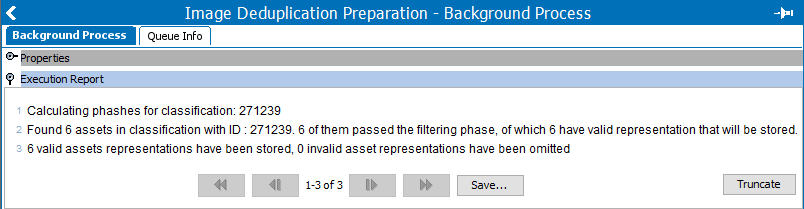First, the images in the 'Tools (ID 271239)' classification are prepared using the 'Prepare images for deduplication' right-click option on the configuration. The 'Image Deduplication Preparation' background process displays the following report which shows the classification ID and the number of images that were assigned a pHash.