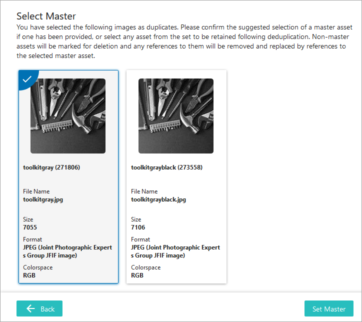 Clicking the Continue button advances to the 'Select Master' page where the selected duplicates are displayed. When the system-selected master (in this example, the TIF image with the name 'tools (271805)') is also marked as a duplicate, that image is automatically marked as the default master on the 'Select Master' page. However, since the system-selected master was not manually selected as a duplicate, no master is automatically indicated on the 'Select Master' page. In this scenario, the user will select a master from the available cards (or use the Back button to return to the previous page and select no images as duplicates).