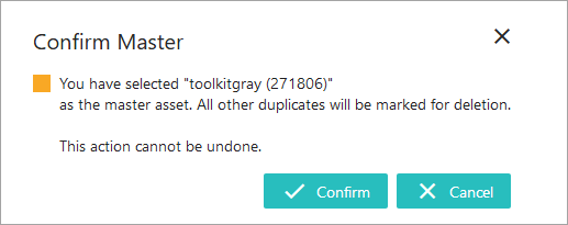 Clicking the Set Master button displays a confirmation message that identifies the image that will be kept and will receive references on the duplicates. All other images displayed will be marked as duplicates and also marked for deletion.