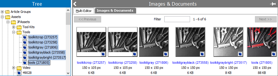 Finally, products that previously targeted duplicate images ('toolkitcrop (273257)' and 'toolkitgrayblack (273558)') via a 'product-to-asset' image reference have been updated to target the master images ('toolkitcrop (273258)' and 'toolkitgray (271806)'). The duplicate images have no remaining references, which allows them to be deleted.