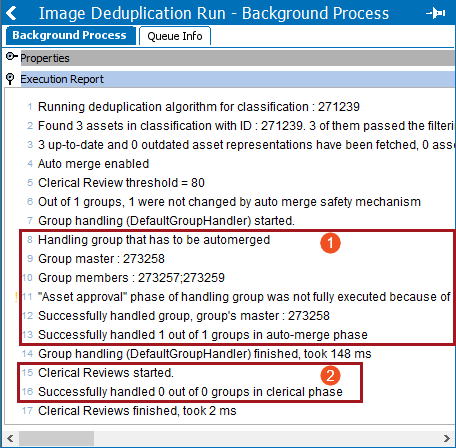 Initially, running image deduplication should include testing to verify that the auto-handling and clerical review settings on the configuration correctly identify the expected duplicate images. Once the configuration is verified to meet the requirements, you will review the background process execution report to determine if images were auto-handled and/or sent to clerical review.