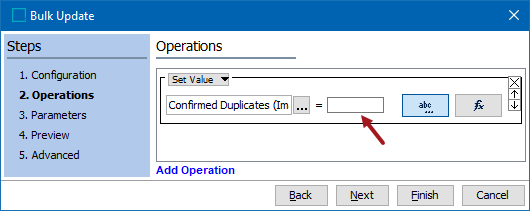- On the Operations step, from the dropdown select the Attribute Values group, and choose the Set Value operation. Leave the value parameter blank to clear the attribute value. For more information, refer to the Attribute Values: Set Value Operation topic in the Bulk Updates documentation.