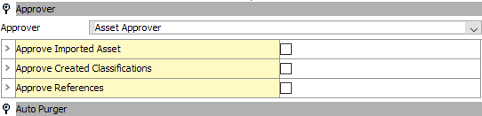 The Approver determines whether assets, references between products and assets, and whether new asset folders should be automatically approved by the Asset Importer. By default, 'Standard Asset Approver' is the only configuration option available for the Approver.
