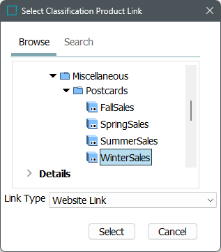 Selecting Add Product opens a dialog allowing the user to browse hierarchies to select a product to link, as well as specifying the link type to be applied.