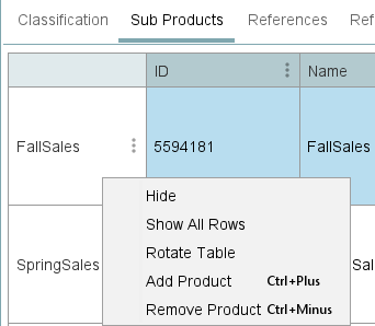 Two views are available using the Rotate Table option. As shown above, the view can be organized to have attributes on the vertical axis. As shown below, the table can also display products on the vertical axis. Right-clicking within the header field exposes different options than within the data fields, including options to add and remove products.