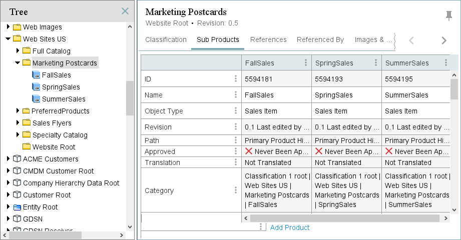 When on a classification, the Sub Products tab is used to display objects of the product super type that are linked into the classification via Product to Classification links. When the selected classification does not have product children (e.g., classifications used to house assets or configurations), the Sub Products tab does not provide any meaningful information.