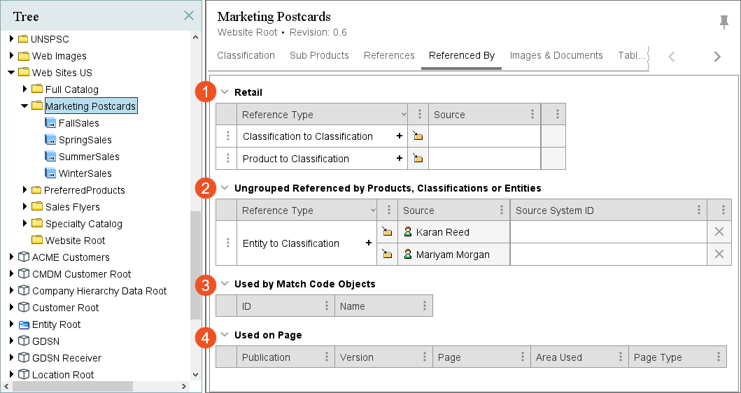 The Referenced By tab is where all references of which the selected object is the target (e.g., all the objects that the selected object is referenced by) can be viewed and edited (assuming proper privileges are in place). In addition, if the object is used by a match code or is used by any publication, that information can be viewed on this tab.