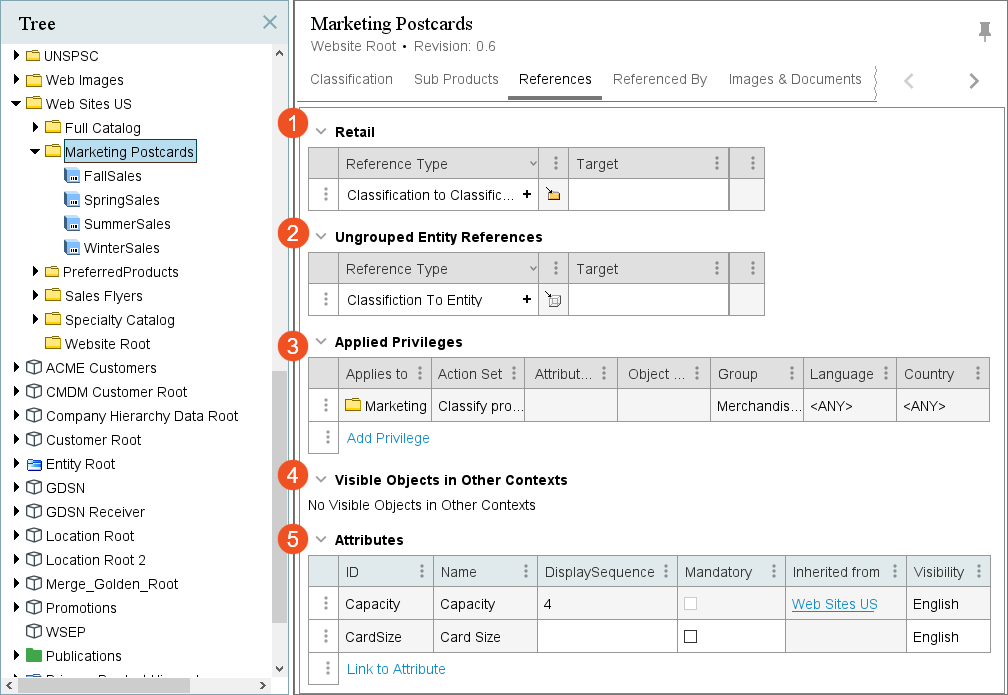 - Ungrouped Referenced by Products, Classifications or Entities: The functionality is identical to what is described for the Reference Sections section above. The only difference is that this area displays references that have not been placed in attribute groups for display purposes.