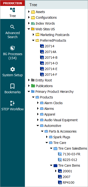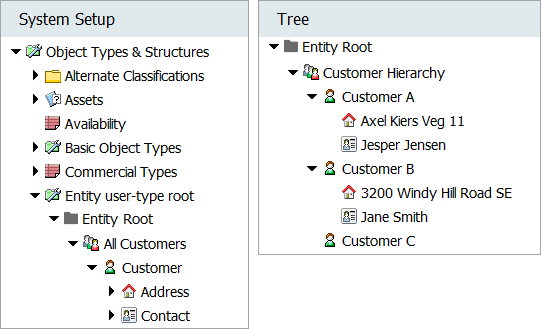 The same principles described for the Primary Product Hierarchy apply to all other hierarchies in STEP. For example, an entity hierarchy could have a customer object type with allowable children of address and contact object types. The object types and structures are defined in System Setup, and instances of these objects can then be created in Tree.