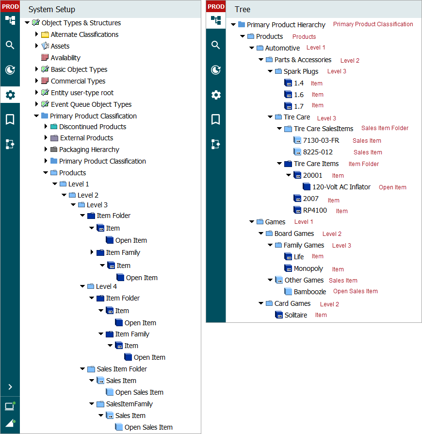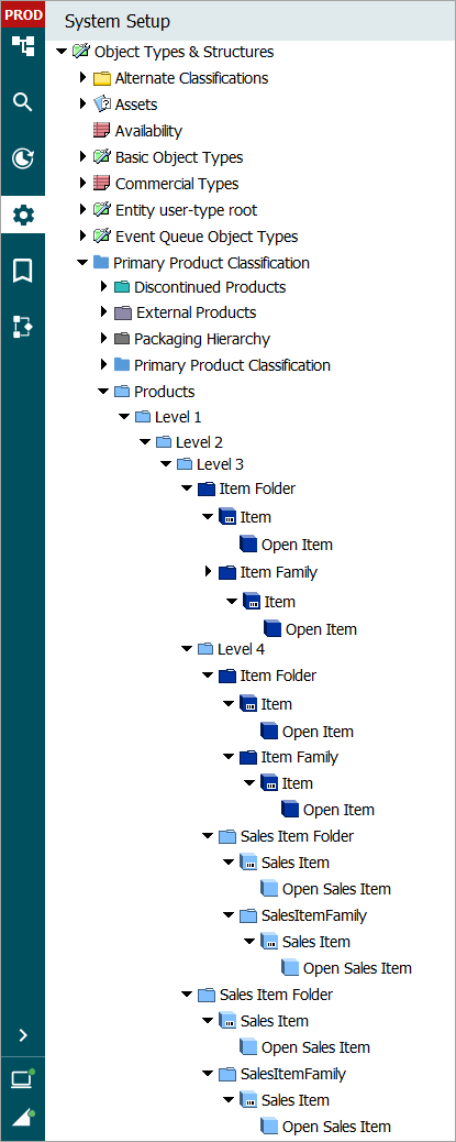 The allowable structure of objects and hierarchies that are accessed in the Tree are defined in System Setup. Continuing with the above example, we can observe that the defined object types and structures include a Primary Product Classification that has a number of levels. A Level 1 can only have a Level 2 child, which in turn can only have a Level 3 child. However, a Level 3 object type can have a number of child object types, including an Item Folder, Level 4, and a Sales Item Folder. A Sales Item Folder is a child of a Level 3 object type, as mentioned, but can also be a child to a Level 4. Similarly, a Sales Item can be child to multiple things, including a Sales Item Folder and a Sales Item Family.