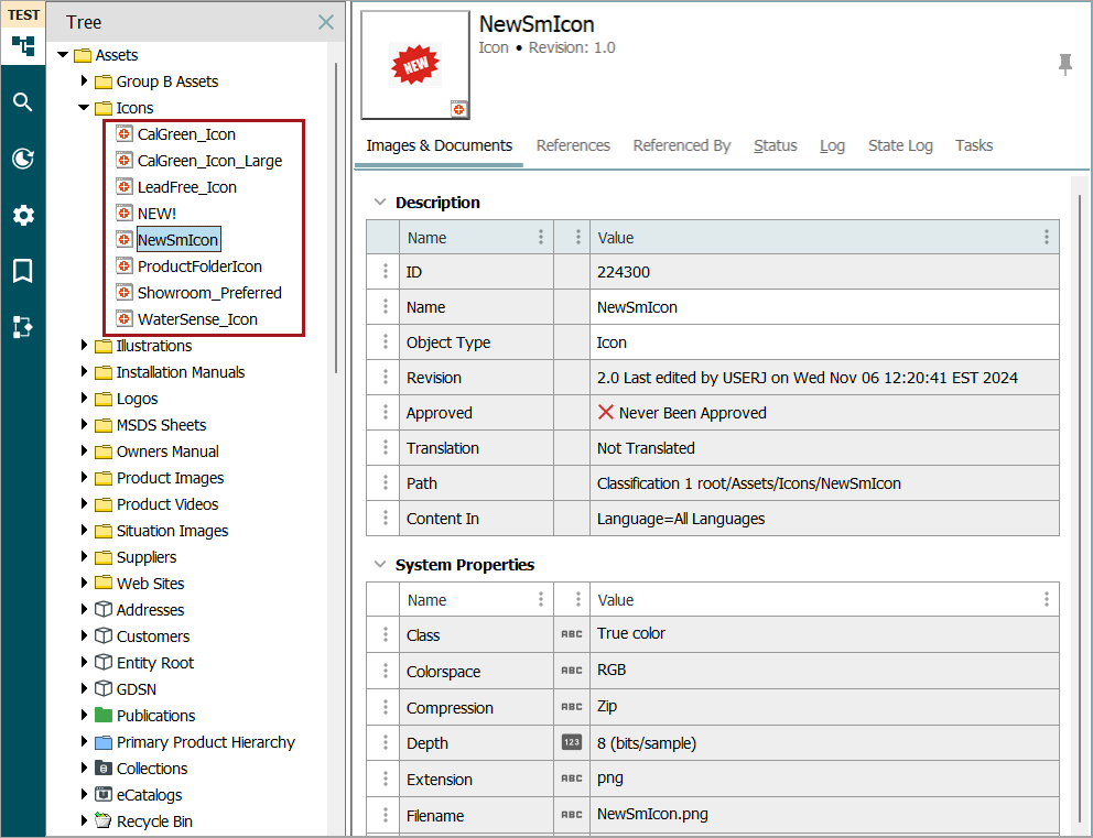 The asset super type is used to hold any type of digital media, including images, videos, documents, and text files. Assets are organized within classifications, and can be linked to other objects in STEP using references. Specifically, assets can be linked to objects of the classification, entity, or product object super types. Upon import, STEP populates some basic information about each asset, which can be viewed under the System Properties section on each asset, but cannot be edited. Default asset icons vary by file type, and can be updated by admin users.