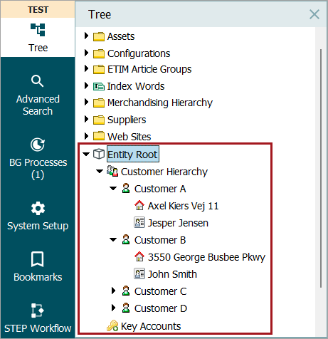 The Entity super type is used to create hierarchies and objects that do not require inheritance of data through categorized groupings. Entities are commonly used to store customer, location, or person data, as well as to store reference data. In addition, entities are used to store source data for golden records. Entities are represented by gray folders and white and gray cubes by default, but these can be updated by an admin user, as is evident in the screenshot below.