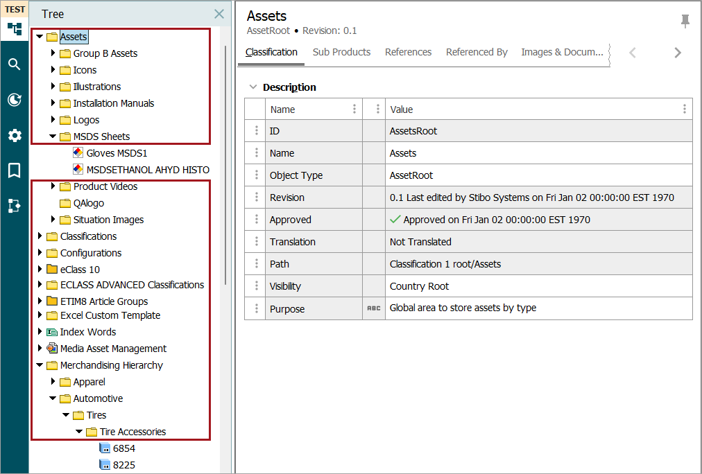 The Classification super type is used to build hierarchies and objects that bundle other objects into organized groupings. These are represented by default with yellow folders in STEP, though these icons may be updated by an admin user. For example, images, manuals, and icons could be uploaded to STEP as assets and stored in appropriate subfolders under the 'Assets' classification folder. Product objects could also be linked into classifications to provide alternative categorizations of objects that vary from the product hierarchy structure.
