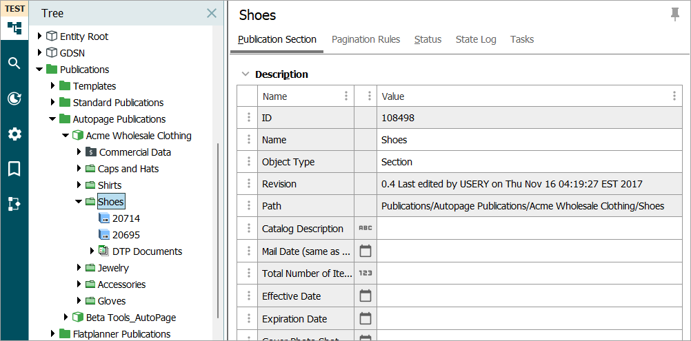 The Publication super type is used to create hierarchies and objects used for print publishing solutions, including Print Publisher, Print Flatplanner, and Print AutoPage. Publication objects are used to create templates used in print solutions, as well as publications such as catalogs or pamphlets. Product objects can be linked into publication hierarchies, meaning data from the product(s) will be reflected in the publication. Publication objects use green icons by default, though these can be updated by an admin user.