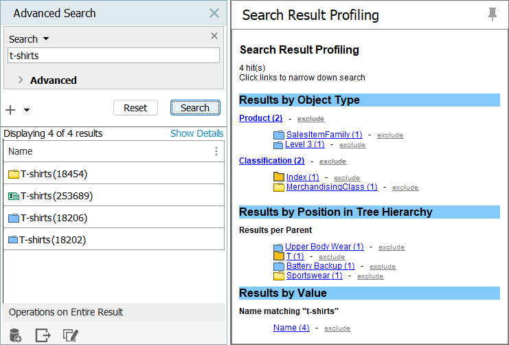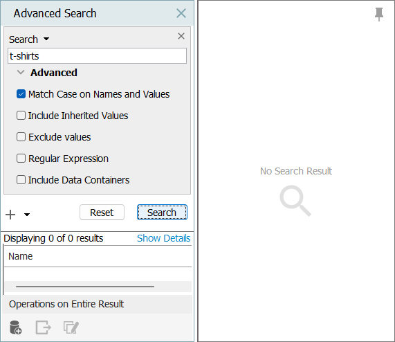 Match Case on Names and Values - When selected, Name and Attribute value searches are not case sensitive. For example, this is a basic search with search criteria of 'Search = T-Shirt.'