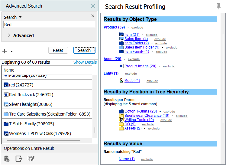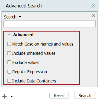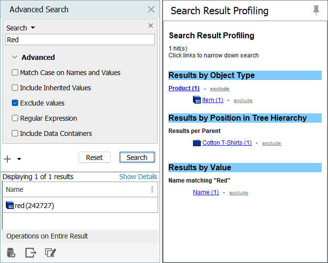 Exclude Values - When selected, attribute values are not searched for the entered search term. If unchecked, attribute values are searched for the entered term and objects with the search term populated as an attribute value are included in the search results.