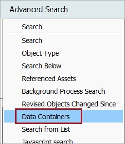 The Data Containers search criterion allows users to limit search results to only objects for which data containers exist for the specific data container types, or those objects for which specific attributes are linked via data containers.