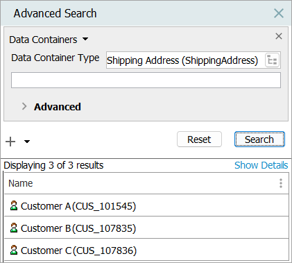 In the example below, a user searches for a data container type called 'Shipping Address' without refining the search any further. If the user selects 'Shipping Address' as the Data Container Type and clicks Search, a list of entities for which a data container has been added to an entity under the data container type 'Shipping Address' will display.