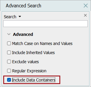 Checking the Advanced option to 'Include Data Containers', and searching again, displays the object as a result.