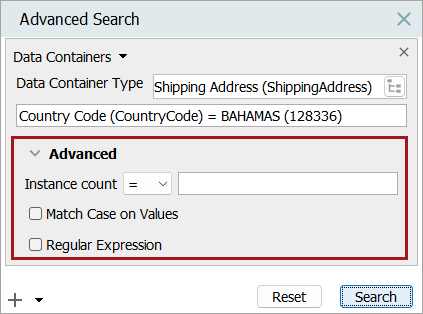 To continue the previous example, if the user refines the search for entities with a 'Country Code' data container type to only include those data containers containing the value 'BAHAMAS', the user would enter 'BAHAMAS' in the input field. In this example, results returned from the search show two of the original four entities. This means that a 'Shipping Address' data container has been added to these two entities, and an attribute within those data containers also contains the value 'BAHAMAS'.