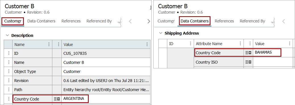 The entity with the ID 'CUS_107835' has an attribute 'Country Code' with the value of 'ARGENTINA' in the Customer tab, but with the value of 'BAHAMAS' on the Data Containers tab.