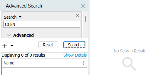 Searching for the value '10 kN' with the standard Search criterion returns 0 results.