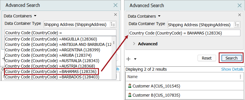 When a search is performed on the ‘Shipping Address' data container and the attribute 'Country Code' is selected, all of the values are displayed. The search result will display the entity ‘Customer B’ only if the value is ‘BAHAMAS.’ The search result will return ‘0’ if the value selected is ‘ARGENTINA’