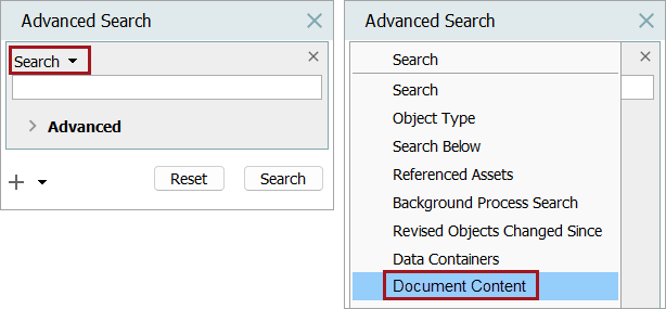 1. Click the Search tab and in the Search dropdown select Document Content.