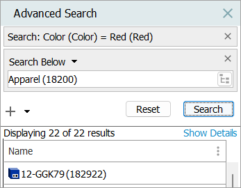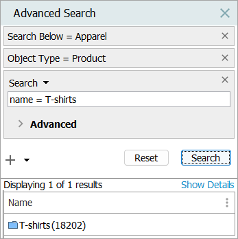 As an example, the search shown below finds objects that have the value 'Red' for the 'Color' attribute AND that are present below an 'Apparel' hierarchy node. The order of criteria does not impact the results.